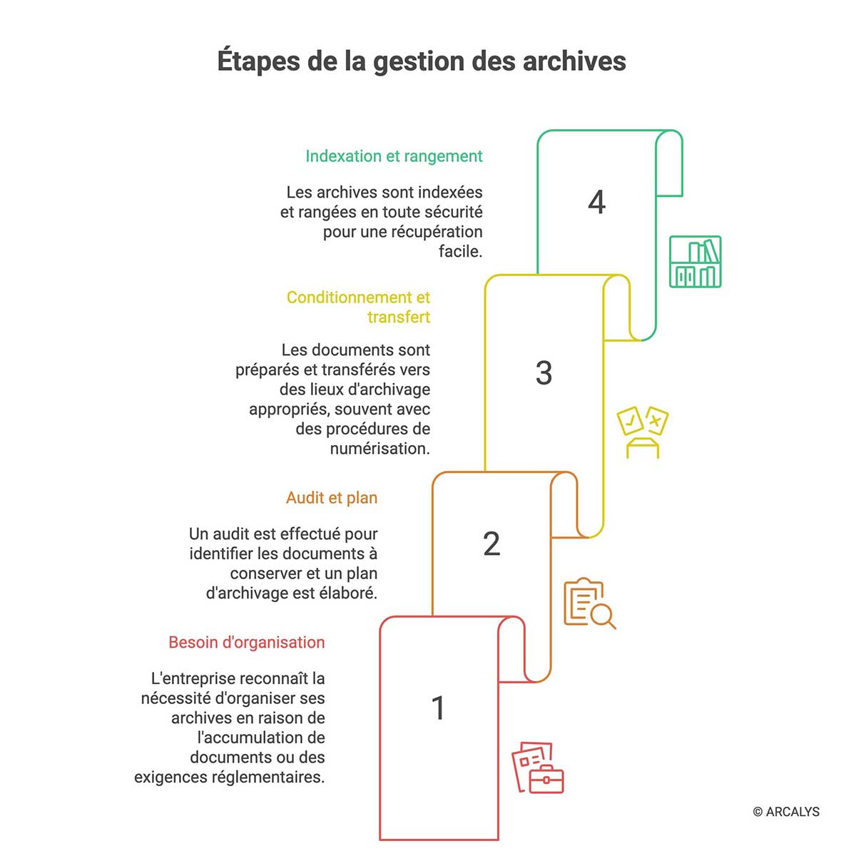 La gestion des archives physiques (et toutes les archives d’ailleurs) ne s’improvise pas. Mettre en place une méthode performante et éprouvée permet de garantir l’accessibilité, la fiabilité et l’intégrité des documents.