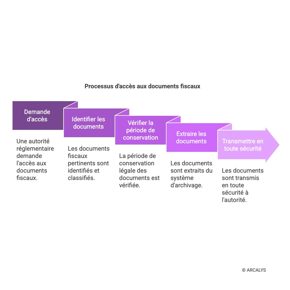 – Demande d’accès, Une autorité réglementaire demande l’accès aux documents fiscaux.- Identifier les documents, Les documents fiscaux pertinents sont identifiés et classifiés.- Vérifier la période de conservation, La période de conservation légale des documents est vérifiée.- Extraire les documents, Les documents sont extraits du système d’archivage.- Transmettre en toute sécurité, Les documents sont transmis en toute sécurité à l’autorité.
